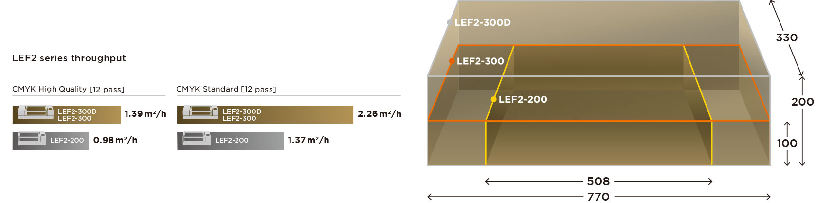 LEF2系列包括三種型號,LEF2-200,LEF2-300和LEF2-300D它們具有不同的工作尺寸和打印速度。選擇最適合您的工作量和您要打印的材料尺寸的紙張。