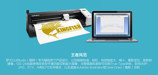 } 羅蘭CutStudio(隨附)讓您無需描畫輪廓即可切割TrueType字體,支持BMP、JPG、STX、AL和EPS文件格式,以及直接從Adobe Illustrator或CorelDRAW切割。